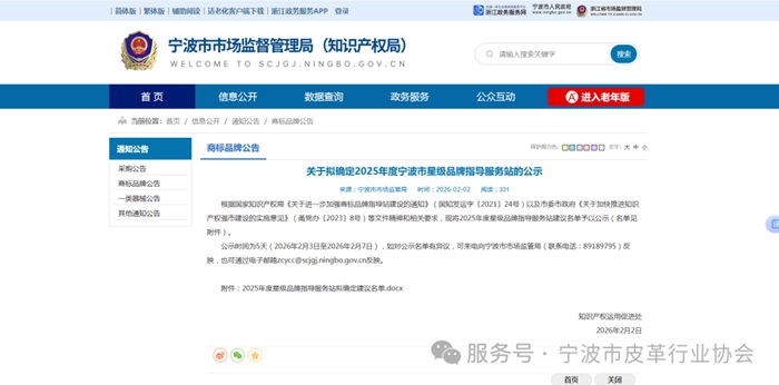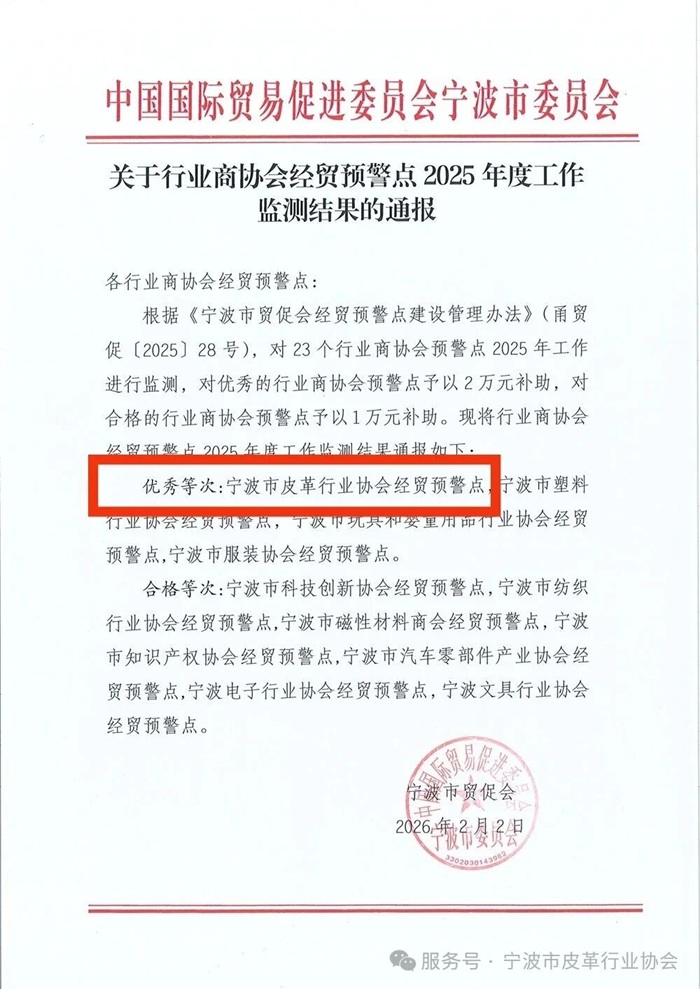 根据国家知识产权局《关于进一步加强商标品牌指导站建设的通知》(国知发运字〔2021〕24号)以及市委市政府《关于加快推进知识产权强市建设的实施意见》(甬党办〔2023〕8号)等文件精神和相关要求,2月2日,宁波市市场监督管理局公示了2025年度宁波市星级品牌指导服务站评定情况,宁波市皮革行业协会被评为“三星级品牌指导服务站”。![]() 自挂牌以来,宁波市皮革行业协会品牌指导服务站始终坚持以提升知识产权创造、运用、保护、管理和服务能力为着力点,积极引导企业实施商标品牌战略,扎实做好知识产权工作的管理与服务工作,在知识产权保护、运用、服务等方面推出一系列举措。 协会品牌指导服务站将以此为新的起点,落脚企业创新服务,聚焦企业知识产权核心需求,深度参与各类标准制定,营造健康良好的市场发展环境,助推行业企业高品质发展! ![]() 根据《宁波市贸促会经贸预警点建设管理办法》(甬贸促〔2025〕28号),对23个行业商协会预警点2025年工作进行监测。宁波市皮革行业协会经贸预警点被评为“优秀等次”。 协会将以此为契机,持续强化预警信息收集、风险研判与企业服务,不断提升经贸预警工作质效,切实为皮革行业外贸稳健发展筑牢风险防控屏障,推动皮革行业经贸预警工作再上新台阶。 |