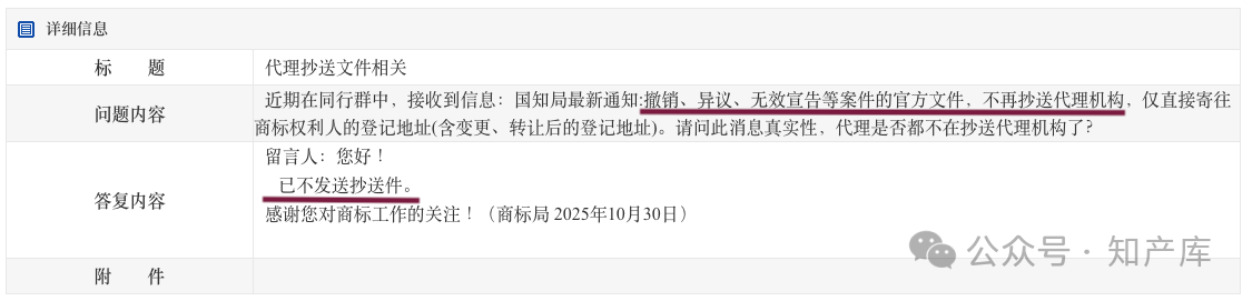 先是,2025年9月,有多个商标代理交流群中流传,“国知局最新通知:撤销、异议、无效宣告等案件的官方文件,不再抄送代理机构,仅直接寄往商标权利人的登记地址”。