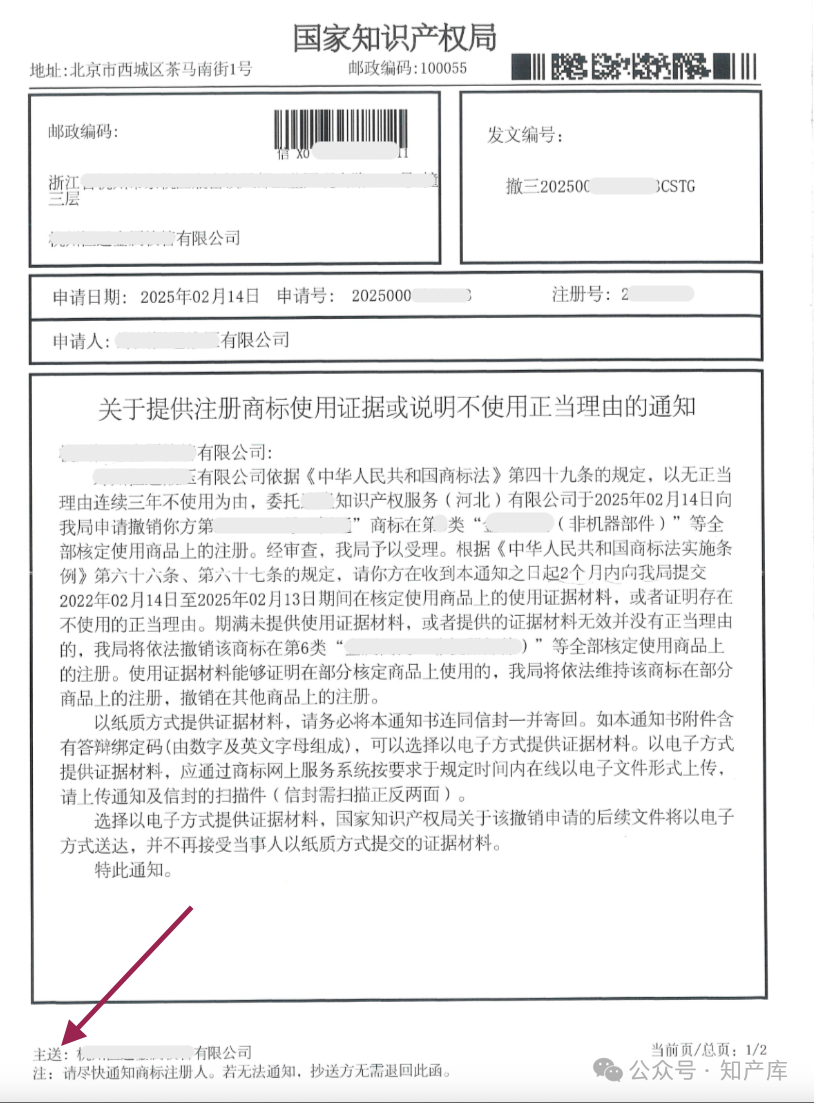 七个大字,答复组同志沉稳坚定的语气、清澈坚毅的眼神,活灵活现的浮现在了眼前...... 还有什么疑问吗,应该没有了吧。 为了勘验“没有抄送”的正式发文情况,知产库走访了附近的热心群众,拿到一份2025年9月送达的只有主送、没有抄送的答辩通知。 ![]() 这是一份撤三举证答辩通知,撤三受理日期为2025年情人节。 商标局寄出邮戳日期为2025年9月20日,送达日期为2025年9月23日。 受理到答辩居然超过半年,这是我不曾预料的。 面对不再抄送代理机构的新形势,代理机构的作用将大大降低,存在感需要自己争取。 商标申请以后,公告期间被异议,代理机构收不到异议答辩通知,那就需要公告期内认真蹲守,一旦发现被异议,及时提醒申请人。 商标注册以后,被人撤通/撤三/无效宣告的,隔三差五或者干脆每两个月检索一次吧,一旦发现被撤通/撤三/无效宣告,及时提醒注册人。 提醒商标申请人/注册人,尽可能在商标申请地址办公,同时盯着所在乡镇/街道的邮政局或邮政所,毕竟这些文书:送达只用挂号信,单位名义从不写联系人,收件人从不写联系电话,...... |